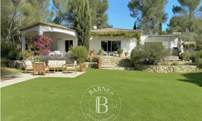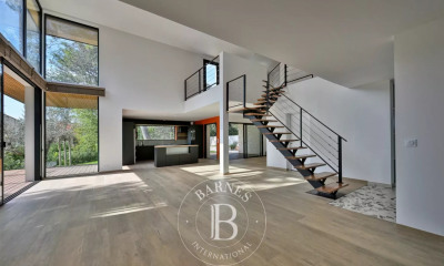 Located in the heart of the highly sought-after residential area of Les Vautes, this spacious, single-storey Californian-style villa of approximately 280 m² offers a true haven of peace, hidden from view, nestled within 2,500 m² of lush greenery. Designed for comfort and family living, it features five bedrooms, including a master suite with private shower room and walk-in closet. An independent office completes the layout—perfect for working from home. The 80 m² living area, bathed in natural light, opens generously onto the outdoors through large sliding doors leading to the terrace and pool area. A contemporary open-plan kitchen creates a seamless flow between the living spaces. Outside, the beautifully landscaped and tree-filled garden ensures privacy and tranquility, while the south-facing swimming pool invites moments of pure relaxation. The villa offers high-quality amenities, including underfloor gas heating, reversible air conditioning, and a 50 m² garage. A rare property in this sought-after area, combining space, peace, and a privileged location.