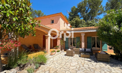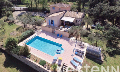 Extender Immobilier presents an elegant neo-Provençal villa of 152m2 in a privileged setting on a flat and wooded plot of 3180m2 at the end of a dead end a few minutes from the village center of Lorgues. Come and enjoy the calm and bucolic environment offered by this beautiful property. The house offers on one level, an entrance with cloakroom, a bright double living room of 49m2 with fireplace insert which extends into a pergola facing south; an independent Provencal fitted kitchen which opens onto a covered terrace; a utility room with direct access to the parking space. Night side, a bedroom with cupboard, a bathroom with shower, a large toilet on the ground floor then upstairs two bedrooms, an office, a shower room and a toilet. The exterior offers a double garage of 42m2, two terraces with dining area, a beautiful 10x5 salt swimming pool with spa on a superb flat garden with trees, perfect for welcoming families, friends and enjoying these beautiful shaded spaces in summer. Possibility of plot detachment. Superb property, well maintained and well laid out... triple genoise, aluminum or PVC joinery, air conditioning in each room.... To visit without delay... For any information, please contact Valérie Boutemy on 06 18 94 06 16 or vb@extenderimmobilier.fr