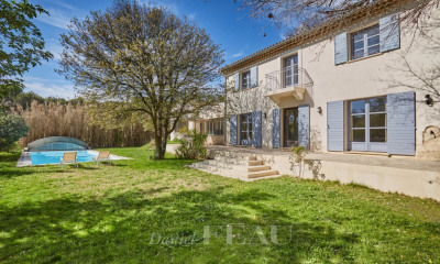 This 260 sqm property with a 50 sqm annex is located in a residential neighbourhood near the forest 5 minutes from picturesque Venelles, 15 minutes north of Aix en Provence and benefiting from easy A51 motorway access. South facing and perfectly maintained, it is set in 4058 sqm of grounds planted with mature oak, olive and cypress trees, and with a terrace, a 12 x 5 metre heated swimming pool, and vegetable garden and orchard. It includes a 76 sqm living/reception room and dining room with a fireplace, a 24.20 sqm kitchen with a pantry and a wine cellar, a 21 sqm study/library, and an over 14 sqm suite and a reading room. The upper floor comprises a 36.80 sqm master suite, and two further 14 and 15 sqm bedrooms sharing a bathroom. With a self-contained 50 sqm apartment with a living room, an open-plan kitchen, a bedroom and a bathroom. This could be joined to the main house if desired. With a 31 sqm garage and two timber chalets.