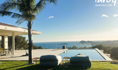 EXCLUSIVITY - Agence JOHN TAYLOR Marseille & Littoral is pleased to present this recent contemporary villa, with a splendid sea view over the entire bay of La Ciotat, located in a quiet area and not overlooked. Completed in 2021 and set on a flat plot of 4,700 m², this villa offers spacious living spaces, with all rooms facing the bay of La Ciotat and the sea. The fittings and furnishings match the project. Life is organized into two independent apartments linked by an elevator (a staircase can be added if desired). The upstairs living space is organized around a vast 90 m² living room bathed in light thanks to its 10 linear meters of bay windows offering a breathtaking panorama. You'll never tire of watching the sunset all year round. The kitchen is semi-open with a central island & dinette and opens directly onto the covered terrace, garden area and heated swimming pool. There are 2 bedrooms, including a beautiful master suite with dressing room, bathroom & shower and separate shower room for the 2nd bedroom. On the garden level, a well-organized apartment with living room and open kitchen opening onto the terrace and south-facing garden with swimming pool. There are 3 bedrooms, including a suite with its own shower room and toilet, and an independent bathroom for the other 2 bedrooms. Separate laundry room. Car enthusiasts will be delighted with the 100m² garage, which can accommodate 5 vehicles. As an annex, and at the entrance to the property, you'll find a 100m² building organized on two levels, which can be transformed into a sports room, workshop, office or other space as required. Built with noble materials and secured by a complete camera system, this house seduces by its contemporary elegance and its privileged location in absolute calm and in a non-buildable environment. From every room, you can gaze out over the Mediterranean, the Bec de l'Aigle and the village of La Ciotat in a natural setting. Agency fees are included in the sale price and are payable by the purchaser. For further information or to arrange a viewing, please contact Sabine Gabrielli, estate agent registered with the Tribunal de Marseille, RSAC: 814 064 291. She can be reached on 06 42 01 23 24 or by e-mail at sgabrielli@john-taylor.com