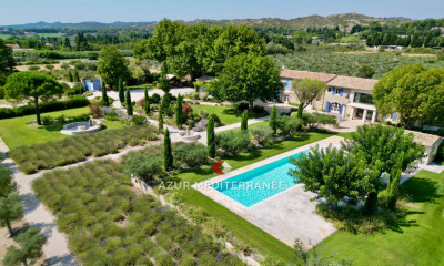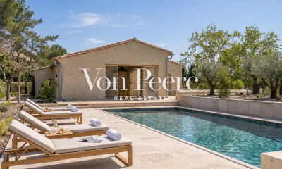 This bright south-facing 400 sqm property is in a peaceful yet not isolated setting just five minutes from the centre of Maussane-les-Alpilles. Meticulously renovated in 2023 and mainly on a single storey, it is set in 2400 sqm of grounds with a swimming pool. It includes a spacious entry with a guest cloakroom, a study, a 62 sqm living/reception room with a bar, a 50 sqm dining room/kitchen with wide patio windows opening onto terraces, and six suites (5 on the ground floor) all with shower rooms and dressing rooms. With a 3-car garage, a pool house, and a summer kitchen and lounge enjoying an open view of the Paradou hillsides. Old materials have been used during the renovation, offering a unique charm to the property. A delightful family home in a sought-after location.