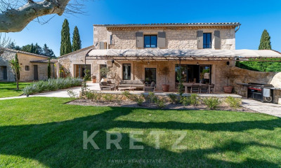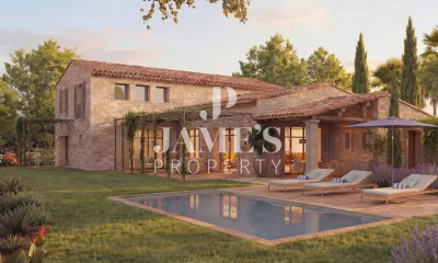 This 19th century “mas” in an ideal location in walking distance of the amenities offers 300 sqm of living space. An elegant entry with a cloakroom leads to a 72 sqm living/reception room with a stone fireplace and exposed beams, a kitchen with walnut work surfaces, a Lacanche range and a wine cellar, and a bedroom with a shower room and dressing room. Upstairs are four suites each with a bath/shower room and dressing room. The 1885 sqm landscaped garden features a 10 x 4 metre heated swimming pool with a shutter, a pool house with a summer kitchen and a barbeque, a self-contained studio apartment with a kitchenette and a shower room, a garage and a car-port.