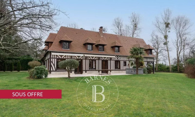 Just 15 minutes from Deauville, in the heart of the Pays d'Auge, Breteuil offers this elegant Norman property with 380 m² of living space, set in over 7 hectares of unspoilt countryside. The main house is captivatingly spacious and bright. The first floor opens onto an entrance hall distributing a fitted and equipped kitchen, which opens onto a vast living room with fireplace. A wrap-around terrace harmoniously extends the living room. A bedroom, shower room, laundry room and separate toilet complete this level, enabling single-storey living. Upstairs, a landing converted into an office leads to six bedrooms, a bathroom, a shower room and a separate toilet. A full basement houses a garage, workshop, storage spaces and the pool's equipment room. The grounds include paddocks, landscaped garden, pond and outbuildings. The covered, heated swimming pool, accessible from both inside and outside the house, blends in perfectly with the rest of the property. This equestrian property offers great potential for the creation of a show jumping stable or a stud farm dedicated to breeding racehorses.