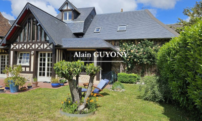 Nestled in a privileged setting, just 5 minutes from Pont l'Évêque and 15 minutes from Deauville, this magnificent half-timbered house offers approximately 162 sq m of living space. Set on a landscaped plot of 582 sq m, it embodies the very essence of character homes in Normandy. Combining the timeless charm of local heritage with contemporary amenities, this property captivates with its authenticity and character. The interior is distinguished by its generous proportions and abundant natural light. The ground floor is centered around a vast, bright living room, whose centerpiece is undoubtedly its superb double-sided open stone fireplace, with a wood-burning stove on the lounge side. A true link between the living room and dining room, it offers a double dose of conviviality, complemented by a separate family kitchen. The main floor comprises three bedrooms, including a master suite complete with a bathtub and dressing room. The house also benefits from an adjoining section designed as a four-room apartment, comprising a living room with an open-plan kitchen, two bedrooms, and a bathroom, ideally suited for comfortably accommodating family and guests. A garage and a boiler room complete this property. Outside, the landscaped garden invites relaxation and tranquility. A sunny terrace is perfect for al fresco dining, enjoying the peace and quiet of the verdant surroundings. While enjoying a serene setting, the property is close to local amenities and transport links, facilitating daily life and allowing for a balance between tranquility and an active lifestyle. This half-timbered house harmoniously combines history, comfort, and the Norman art of living. A rare and elegant address, ideal for a primary or secondary residence. ENERGY RATING: D / CLIMATE RATING: D Estimated average annual energy costs for standard use, based on energy prices for 2021, 2022, 2023, and 2024: between EUR3,630 and EUR4,960. Information on the risks to which this property is exposed is available on the Géorisques website: www.georisques.gouv.fr Contact: Anne AMOURETTE, Independent Sales Agent 33 6 07 30 13 90 EI RSAC: 402 516 447 RCS Nantes