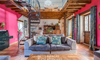 West of Tours, just an hour from Paris by TGV, this 18th-century mill sits elegantly within a rare natural setting, in the immediate vicinity of the Loire Valley châteaux. Nestled within a park of approximately two hectares, bordered by a tributary of the Loire, the property benefits from a preserved, verdant environment, part of which is classified as a Natura 2000 site.