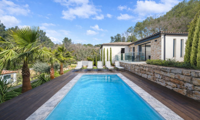 Just five minutes from the charming village of Lorgues, in a sought-after residential area, this rare property beautifully combines contemporary luxury with the authentic charm of Provence, all nestled in a preserved natural setting with no overlooking neighbors. Behind its electric gate lies a 4000 m² enclosed plot, beautifully landscaped with palm trees, Mediterranean plants, and sun-drenched relaxation spaces.
