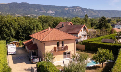 Just 7 minutes from Bardonnex customs and 20 minutes from the center of Geneva, this contemporary 2007 villa offers 353 m² of living space (386 m² of floor space) on 1028 m² of wooded, enclosed grounds with swimming pool and jacuzzi. Situated at the end of a cul-de-sac in a quiet, sought-after residential environment, it boasts spacious, luminous rooms and top-of-the-range features. From the entrance, a glass door leads to a vast hall that opens onto a 74 m² living room with high ceilings, bathed in light thanks to large south-west-facing bay windows. The space comprises a living room with pellet fireplace, a dining room and a fully-equipped open kitchen, all extended by a terrace giving access to the garden and pool area. This level is also home to a master suite with dressing room, private shower room and toilet, as well as a double garage and guest bathroom. Upstairs, an elegant passageway opens onto the living room and leads to four comfortable bedrooms, two with balconies, a bathroom with toilet and a shower room with toilet. The more than 150 m² basement is fully equipped and offers a wide range of spaces: a laundry room, a storeroom, a relaxation room with sauna, an office, a carnotzet-style reception room with wine cellar and fitted kitchen, as well as a cinema or gym area, all complemented by an access ramp ideal for two-wheeler enthusiasts wishing to store their vehicles. Designed for optimum comfort, the villa boasts excellent energy efficiency (class C), thanks to its low-temperature underfloor heating powered by a recent heat pump (2023), solar water heater, double-glazed PVC joinery with electric roller shutters and pellet-burning insert. The flat, fully enclosed plot, secured by a motorized gate, features a paved courtyard for parking several vehicles, a garden shed and a beautiful outdoor space including a covered swimming pool, Jacuzzi and a vast L-shaped terrace facing southwest, perfect for enjoying sunny days. A rare opportunity for families looking for space, comfort and luxury features, in a privileged setting close to Geneva and motorway access. ECD carried out on September 8, 2022 Consumption (primary energy): 132 kwh/m²/year (class C) Of which greenhouse gas emissions: 4 kgCo²/m²/year (class A) Estimated maximum annual costs: between €1,720 and €2,400 per year (average energy prices indexed at January 1, 2021)