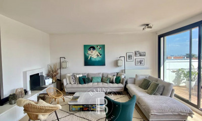 The entrance opens onto a staircase leading to a landing that serves a spacious living area, including a lounge with a fireplace and video projector, a dining area, and an open-plan fitted and equipped kitchen. This space provides access to an 18 sqm south-facing terrace. The apartment also features two bedrooms with built-in wardrobes, as well as a master bedroom with air conditioning and a dressing room. A bathroom with shower, a laundry room, and separate toilets complete this level.