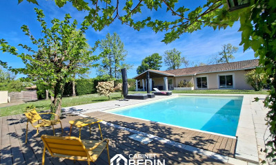 The recent restoration of this late 18th-century residence reflects a demanding approach, combining high-quality materials with rigorous respect for the original architecture. Upon arrival, a distinctive gate opens onto the park; the ashlar façade, historic windows, and period features affirm the heritage of the property. The estate retains a unique history, notably marked by the presence of a former chapel, of which vaulted openings and a distinctive atmosphere remain, contributing to the soul of the property. The 320sqm main house comprises, on the ground floor, a living room, a dining room, a kitchen with a pantry, an office, and a bathroom. At the rear, a garage and a storage room complete the functional spaces. Upstairs, the layout features three bedrooms and an attic bedroom, as well as a bathroom. Independent annexes further enhance the accommodation capacity, bringing the total to five bedrooms and three bathrooms. The property also includes a second, independent house of 110 sq m, requiring complete renovation. Outside, the approximately 1.5-hectare wooded park reinforces the feeling of space, tranquility, and privacy. A heated swimming pool completes the ensemble, offering discreet and sustainable comfort. Finally, the property boasts a rare advantage: a preserved environment, yet only 7 minutes from the Bordeaux ring road, ensuring a highly desirable combination of nature and accessibility.
