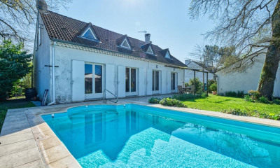 Redesigned in the early 1980s to optimize its space and functionality, it now combines old-world charm with modern comforts. A few updates will reveal its full potential. Upon entering, a 15 sq m hall sets the tone and opens onto a welcoming living room with a beautiful fireplace. The left wing houses a convivial dining room, a laundry room, and a generously sized kitchen. On the right wing, you will find a separate WC and a bedroom with an en-suite shower room, ideal for guests or for single-level living. Upstairs, the staircase leads to a landing which, on the right wing, provides access to an office and a bedroom with an en-suite shower room. The right tower of the house has been converted into an intimate sleeping area, offering a unique experience beneath a magnificent exposed timber frame. Three further attractive bedrooms, boasting remarkable ceiling heights, and a bathroom of approximately 9 square meters complete this level. A 14-square-meter veranda, in need of some updating, offers excellent potential and invites you to imagine a bright living space opening onto the garden. Outside, the garden offers a variety of settings to fully enjoy sunny days at any time of day, culminating in a recently installed swimming pool, perfect for relaxing with family and friends. Finally, a 40-square-meter outbuilding, along with a cellar of the same size, completes this exceptional property. This space offers numerous possibilities for development, including the creation of a garage.