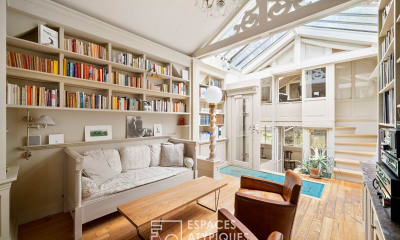A 250-m² triplex flat on the top floors of an 18th-century building, with views over the rooftops of Paris, between Saint-Germain-des-Prés and the Bon Marché department store. Built in the 18th century, like most of the other buildings on this street, the impressive six-storey historical façade is cadenced by three vertical rows of windows with wrought-iron guardrails. With an antique shop on the ground floor and a top floor built under the eaves, the U-shaped building is organised around a central interior patio, safeguarded by a security door and gate. As for the flat, located on the building's third, fourth and fifth floors, it is directly accessible via either a lift or a staircase, the latter of which, reserved solely for this flat as of the 3rd floor, is in the process of being renovated. On this same floor, the flat's front door opens onto a sunny living room, separated from the other rooms by an intricate composition of ancient beams. With an impressive floor-to-ceiling height and two wide windows that look out over the rooftops of the neighbouring private mansions, this room is located next to a bedroom, also facing east, but sheltered from view, while a bathroom and shower room are located in the middle of the flat. As for the southern wing, it contains a large kitchen with a dining area, original terracotta floor tiles and direct access to the lift, as well as an adjacent sunny second bedroom. On the fourth floor, at one end of the flat, there is another kitchen and its adjacent dining room, both bathed in light thanks to skylights as well as their windows overlooking the interior courtyard. After ascending a few steps, a mezzanine living room extends the living space around the top of the staircase, while, on this same level, two large bedrooms, facing east, each have their own private bathroom and a wardrobe. An interior, glassed-in staircase provides access to the last level, with a floor area of more than 50 m², currently used as sleeping quarters with a bedroom and its own immense bathroom and walk-in wardrobe, but which could also be turned into a living area. As for the conservatory, two-thirds of which is open, it easily transforms into a patio with panoramic and unobstructed views over the rooftops of Saint-Germain-des-Prés and the bell towers of the nearby Saint-Sulpice church.