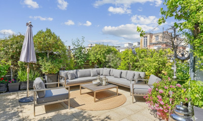 Finally, at the top, the house opens onto an incredible furnished rooftop, with its summer kitchen and unobstructed views of the Parisian rooftops. This top level, bathed in light and protected from the noise of the city, constitutes a suspended interlude, a true haven for special moments.