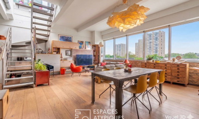 Just steps from the Parc des Buttes-Chaumont, nestled between the discreet villas of La Mouzaïa and the lively atmosphere of Village Jourdain, this 148.57 sq m (Carrez law) loft occupies the ground and first floors of a 1925 building, formerly an office building.