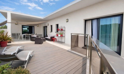 Nestled on a superb landscaped plot of approximately 2,800 m², this elegant character property, reflecting the architectural style of Southwest France, offers 292 m² of living space and charms with its country house architecture, blending generous proportions, authenticity, and contemporary comfort. From the moment you enter, the house reveals a warm and welcoming atmosphere: a lovely entrance hall with a pantry, a shower room with WC, and then a convivial kitchen-dining room opening onto a spacious living room of approximately 50 m², enhanced by a fireplace and high ceilings. The fluid and elegant interior layout is organized around two staircases serving the different levels. Upstairs, there is a second living room of the same size, extended by a mezzanine, a shower room with WC, a bathroom with WC, and three comfortable bedrooms. An intermediate level houses a large additional bedroom, with a north/south orientation, ideal for a separate suite or guest area. Outside, the setting lives up to the location: a 17 x 5 m swimming pool, a terrace combining wood and polished concrete, a summer kitchen, and vast, meticulously maintained green spaces, perfect for relaxation and spending time with family and friends. The amenities harmoniously complement the property: a well, central heating via a heat pump, air conditioning in certain rooms, a master suite with a walk-in closet at the head of the bed, and ample storage. Situated in a desirable area, just minutes from the Saint-Thomas golf course, motorway access, and shops, this property is a superb family home in the countryside, combining character, spaciousness, and quality of life. Information on the risks to which this property is exposed is available on the Georisques website: www.georisques.gouv.fr. Agency fees are payable by the seller.