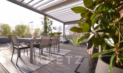 The large living room with a built-in fireplace, which is open to the outside thanks to large triple-glazed windows, opens onto the terraces and garden, creating a natural continuity between indoors and outdoors.