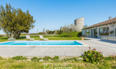 Located in Sémillac in a peaceful and privileged setting, this magnificent master house of approximately 3O0 m² of living space, built around 1850 and fully renovated with taste, combines the charm of the past with contemporary comfort. It features a spacious entrance hall, a living room with a monumental fireplace, a large, bright 70 m² reception living area opening onto the terrace and park, a fully equipped and functional kitchen, five spacious bedrooms including one on the ground floor, three elegant bathrooms, and two separate toilets. The generous volumes, 3.30 m high ceilings, and the quality of the finishes impress from the very first visit. The house is fully equipped with a comprehensive smart home system (heating, air conditioning, alarm, connected locks), as well as a pellet boiler and a wood-burning stove for optimal comfort in all seasons. The property extends over a beautiful south-facing wooded park of more than 4,000 m², where a swimming pool could easily be installed. Outbuildings of approximately 220 m² (garage, basement, workshop, former bread oven) offer numerous possibilities for development, including guest cottages, bed and breakfasts, or independent spaces, while maintaining the privacy of the main house. Just a few minutes from Mirambeau, with access to the A10 motorway and 45 minutes from Bordeaux Airport, this prestigious residence combines authenticity, elegance, serenity, and proximity to Jonzac, the beaches of Meschers and Royan, as well as the most beautiful historical, natural, and wine-growing sites of southern Charente-Maritime, offering an exceptional lifestyle for unforgettable stays.