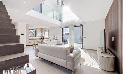 A generous family home designed over four levels, three of which are residential. Fluidity, brightness, and generous volumes characterize this contemporary home with its meticulous features. Beyond its comfort and beautiful functionality, architect Bachmann proposed modular spaces to offer a unique layout and perspectives, particularly on the garden level where a charming open-air patio is inserted between the living room and the open-plan kitchen to provide beautiful light and create cozy spaces. The same is true for the entrance, highlighted by a designer staircase and a skylight that will continue on all upper levels. The upper floors feature large sleeping areas. Two junior suites, a bedroom, an office, and a bathroom are on the first floor, while a vast master suite is on the second level, comprising a landing, a bathroom, a charming bedroom with a terrace, a dressing room, and a separate toilet.