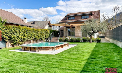 In Ayse, nestled in a pleasant, green setting, discover this charming 5-room house (T5) with 138 m² of living space, situated on a beautiful 1,035 m² plot, offering ample room, light, and comfortable living. On the ground floor, the entrance hall leads to a lovely bedroom, a dressing room, a shower room, a separate WC, and a small pantry. You'll be captivated by the spacious and bright living room, featuring a wood-burning stove and a fully fitted and equipped open-plan kitchen. This inviting space extends into a veranda with direct access to the south-facing terrace and garden, allowing you to fully enjoy sunny days and pleasant views of the surrounding mountains. Upstairs, you'll find two bedrooms with built-in wardrobes, both with access to a shared balcony. A bathroom with WC and an open-plan storage area complete this level. This versatile space can easily serve as an office, playroom, or be converted into a fourth bedroom, depending on your needs. The property also includes a carport and two garages with electric doors, incorporating a laundry area and additional storage space. Outside, a paved courtyard provides parking for several vehicles. The meticulously maintained and landscaped garden features a large swimming pool, ideal for relaxing with family and friends, as well as a bioclimatic pergola, perfect for adapting to the weather and providing shade for summer meals. This property combines comfort, spaciousness, and quality of life in a peaceful setting, while offering excellent accessibility: less than 5 minutes by car from the train station, the Guillaume Fichet high school, the Lucie Aubrac elementary school, and the Bonneville town center with all its amenities. Access to the motorway is immediate, allowing you to reach Geneva in approximately 30 minutes and Annecy in approximately 40 minutes. For more information or to arrange a visit, contact me on 06 76 35 89 60. The fees are to be paid by the seller.<BR>Les informations sur les risques auxquels ce bien est exposé sont disponibles sur le site Géorisques : www. georisques. gouv. fr.<BR><BR>** ENGLISH SPEAKERS: please note that Capifrance has an international department that can help with translations. To see our range of 20,000 properties for sale in France, please visit our Capifrance website directly. We look forward to finding your dream home!