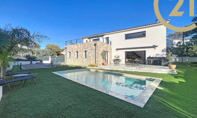 En un lugar tranquilo, esta casa (Villa) 158,6 m², con un terreno de 1000 m² comprende 5 habitaciones incluidos 4 dormitorios, 1 cuarto de baño y 2 WC. Ella està dotada de un salón, de una cocina Ninguna, de un balcón, de una piscina, de un sótano y de un aparcamiento. Calefacción : Individual.