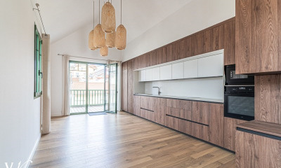 La planta baja incluye una entrada, un salón, un comedor, un rincón de estudio, una cocina independiente, un lavadero, un estudio con dormitorio y baño. En la planta alta, un despacho, cuatro dormitorios — tres con baño privado — un cuarto de ducha, pasillos y un segundo aseo forman un conjunto coherente. Los espacios, bien distribuidos, mantienen su lógica inicial. Los interiores llaman hoy a una nueva mirada, una reinterpretación que conjugue el espíritu del lugar con usos contemporáneos.