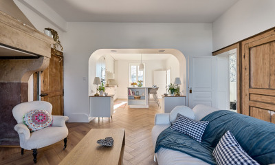 La distribución favorece una vida fluida, en una sola planta, pensada para acoger. Los espacios se organizan con generosidad, lo que permite contemplar varios usos: casa de ciudad singular, lugar de recepción o actividad de acogida ya estructurada. Las numerosas habitaciones ofrecen una preciada intimidad, y cuatro suites disponen de su propio cuarto de baño, lo que refuerza la sensación de autonomía y comodidad. El salón, de proporciones adecuadas, se convierte en un punto de anclaje acogedor. Aquí, recibir invitados no es un proyecto, es algo evidente, impulsado por el propio lugar.