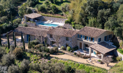 Ubicada en una tranquila zona de Cogolín, esta villa de una sola planta de 238,55 m² se asienta sobre una parcela ajardinada de 1.309 m² rodeada de viñedos. Cuidadosamente renovada en 2012, encarna el estilo de vida mediterráneo en un entorno verde y exuberante. En la casa principal de 150 m², la elegancia de sus proporciones se aprecia desde el primer momento, con una amplia y luminosa zona de estar de 66 m² que integra un acogedor salón (con chimenea) y una cocina americana totalmente equipada. Grandes puertas correderas de cristal crean una conexión fluida con el exterior, inundando el espacio de luz natural. La villa ofrece dos dormitorios en suite, incluyendo una lujosa suite principal con vestidor, baño con ducha y bañera de hidromasaje. Un despacho, una lavandería y aire acondicionado en toda la vivienda garantizan una funcionalidad y comodidad óptimas. El exterior invita a la relajación: una amplia terraza conduce a una piscina climatizada de mosaico de 9 x 5 m, complementada por una espaciosa caseta de piscina de 30 m² (con cocina equipada, comedor y chimenea) con vistas panorámicas a los viñedos. El jardín mediterráneo completa este entorno idílico. Una de las principales ventajas de esta singular propiedad es su apartamento independiente de 65 m² con dos dormitorios y terraza privada, ideal para recibir invitados o generar ingresos por alquiler. Una bodega y amplio espacio de almacenamiento completan la propiedad. ¿Busca un espacio habitable amplio, adaptable y excepcional? Contacte sin demora con la agencia Espaces Atypiques Saint-Tropez para descubrir el encanto provenzal de esta villa única. CALIFICACIÓN ENERGÉTICA: B (104 kWh/m²/año) / CALIFICACIÓN CLIMÁTICA: A (3 kg CO?/m²/año). Costes energéticos anuales estimados para un uso estándar entre 1390 EUR y 1940 EUR, indexados a los años 2021, 2022 y 2023 (suscripción incluida).