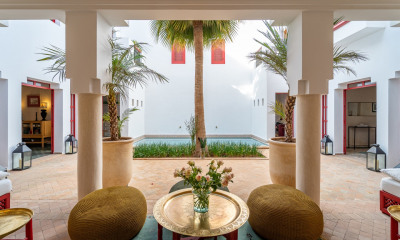 Véritable joyau niché au coeur de la Palmeraie, cette propriété de 13 suites réparties sur un parc de 2.5 hectares est le gage d'un séjour unique. Alliant le style marocain et le confort moderne, vous aurez la possibilité de vous adonner à une multitude d'activités sportives et de loisirs : tennis, padel, pétanque, tir à l'arc, superbe salle de cinéma, kids club ainsi que 2 piscines de 21 mètres et un jacuzzi extérieur. Un espace bien être de 200 m2 avec salle de sport, hammam, salle de massage et jacuzzi vous permettra également de vous relaxer dans les meilleures conditions pendant vos vacances. L'apex du confort et du luxe pour un séjour idyllique. A partir de 12 000 € par nuitée. Tarifs soumis à variation selon la saison.