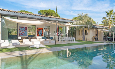 Entourée de vignes et de pins parasols, avec une belle vue sur la mer et la baie de Pampelonne, superbe propriété neuve nichée dans le quartier des Marres à Ramatuelle. D’architecture contemporaine, tout en s’inspirant du charme tropézien, la propriété offre des prestations très haut de gamme, avec des matériaux nobles, dans un environnement des plus agréables. La villa développe de grands volumes, avec une surface totale d’environ 510 m² répartis sur 3 niveaux, comprenant notamment 6 suites, une grande pièce de vie lumineuse offrant une vue dégagée sur le panorama verdoyant avec la mer à l’horizon. Bar/cave à vin, salon home cinéma, salle de fitness, hammam, espace pour le personnel. La propriété profite d’un beau terrain paysager de 4050 m², agrémenté de vastes terrasses, d’une piscine de 18 mètres de long, d’un pool house et d’un grand garage. Système de sécurité, système de son, domotique. Numéro d’agrément : 83101000078VO
