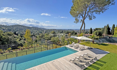 À quelques minutes du vieux village de Mougins, au coeur d'un quartier résidentiel, splendide villa contemporaine offrant de sublimes spectacles de coucher du soleil révélant un paysage absolument merveilleux. La villa décorée avec goût et bénéficiant de prestations haut de gamme est composée comme suit : À l'étage principal : - Une spacieuse pièce de vie lumineuse s'ouvrant sur le jardin et la piscine et offrant une magnifique vue sur les collines - Une cuisine entièrement équipée - Une terrasse avec espace repas à l'abri du soleil et différents espaces de détente - Une chambre de maître en suite avec vaste dressing, salle de bains - Une chambre double en suite avec salle de bains - Deux chambres double en suite avec salle de douche et accès à une terrasse privative - Une buanderie À l'étage inférieur : - Un espace détente avec salon TV, billard et bar - Un chambre en suite avec salle de douche Espaces extérieurs : Jardin paysager d'environ 2500 m2 avec de différents coins de détente, salle à manger d’été.