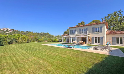 Villa de luxe 5 chambres avec vue panoramique sur la campagne. Nichée dans une impasse paisible, cette villa contemporaine de 5 chambres et 5 salles de bain allie design raffiné et art de vivre méditerranéen. Le vaste séjour avec salle à manger s’ouvre entièrement sur une grande terrasse ensoleillée grâce à de larges baies vitrées, offrant un espace idéal pour les repas en plein air, la détente et la contemplation de la vue dégagée sur la campagne. La suite parentale dispose d’un dressing et d’une superbe salle de bain avec baignoire. Trois autres chambres bénéficient chacune de leur salle de bain privative, dont deux avec terrasse et coin salon extérieur. Au niveau inférieur se trouvent une cinquième chambre avec salle de bain ainsi qu’un espace ouvert idéal pour la détente, le sport ou le yoga. À l’extérieur, le jardin méditerranéen garantit une intimité totale (aucun vis-à-vis), tandis que la terrasse sur le toit offre un lieu paisible pour une séance de yoga matinale ou un apéritif au coucher du soleil, face aux collines et à leurs magnifiques lumières du soir. Cette villa offre un équilibre parfait entre luxe, confort et nature, idéale pour des vacances paisibles et élégantes à quelques minutes du charmant village de Mougins et des plages de la Côte d’Azur.