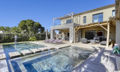 Dans un écrin de verdure, au cœur du très convoité Domaine des Parcs de Saint-Tropez, propriété d’architecture provençale aux intérieurs modernes entièrement rénovée avec des matériaux de qualité. Cette élégante et chaleureuse villa à la décoration bohème et aux prestations soignées, développe une surface d’environ 335 m2 comprenant notamment des espaces de vie orientés vers les terrasses, et 5 suites. La demeure, exposée Sud, profite d’un superbe terrain paysager plat de 4960 m2, complanté de majestueux pins parasols et d'essences méditerranéennes, et agrémenté d’une belle piscine chauffée, de plusieurs terrasses, d’un pool-house et d’un terrain de pétanque. Garage double. Climatisation. Salon télé. Une propriété authentique dans un environnement paisible et sans vis-vis, à l’une des adresses les plus prisées de Saint-Tropez.