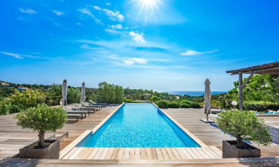 VILLA AVEC PISCINE ET JARDIN BORD DE MER HONNORAIRES A LA CHARGE DU PROPRIETAIRE Au sud de Porto-Vecchio, face à la Sardaigne dans un domaine privé cette propriété est exceptionnelle par son emplacement, elle offre un spectacle à plus de 180° sur les plus beaux paysages de Corse du Sud ; la Sardaigne, les Iles Cerbicales, la plage de Palombaggia et le golf de Santa Giulia. Édifiée sur un parc arboré de 4000 m2, d'une surface habitable d'environ 300 m2, cette très belle réalisation contemporaine est desservie par de vastes et multiples terrasses en teck, les volumes sont épurés et les espaces sont baignés de lumière. La piscine à débordement de 13X5m donne l'impression d'être suspendue au-dessus de l'eau, elle offre un spectacle sans limites, entouré d'un joli jardin paysagé. COMPOSÉE COMME SUIT : Niveau principal/Vue grand large dans toutes les pièces • Une entrée avec baie vitrée donnant sur la mer • Un vestiaire invité + cabinet de toilette invités • Spacieux salon avec larges baies vitrées entrant dans les murs ouverts sur la terrasse principale • Salle à manger ouverte sur terrasse • Cuisine open space avec terrasse attenante Niveau supérieur/Vue grand large chambres & salles de bains • Une suite de maitre climatisée donnant sur la terrasse avec salles de bains et WC • Un bureau • Un dressing Niveau inférieur/Chambres & salles de bains avec vue mer • Salon TV • 4 chambres climatisées • 4 salles d'eau avec WC • Une buanderie Espaces extérieurs • Salle à manger • Salons • Ping Pong • Abri voitures • Douche Équipements • Barbecue • Baby-foot • Linge fourni • Service possible INFORMATIONS PRATIQUES • Accès mer : Petite crique de sable fin à 10mn à pied • 15mn du centre de Porto- Vecchio en voiture • 7mn des plages de Palombaggia et Santa Giulia • Aéroport de Figari 25km, 30mn • Golf de Spérone 25km VILLA WITH POOL AND GARDEN SEASIDE FEES PAYED BY OWNER South of Porto-Vecchio, facing Sardinia in a private domain this property is exceptional by its location, it offers a show at more than 180° on the most beautiful landscapes of Southern Corsica ; Sardinia, the Cerbicales Islands, Palombaggia beach and Santa Giulia golf course. Built on a park of 4000 m2, with a living area of about 300 m2, this beautiful contemporary construction is served by vast and multiple teak terraces, volumes are refined and spaces are bathed in light. The 13X5m infinity pool gives the impression of being suspended above the water, it offers a show without limits, surrounded by a pretty landscaped garden. COMPOSED AS FOLLOWS : Main level/Wide view in all rooms Entrance with bay window overlooking the sea Guest cloakroom + guest washroom Spacious living room with floor-to-ceiling windows entering the walls open to the main terrace Dining room open to terrace Open space kitchen with adjoining terrace Upper level/Large view large bedrooms & bathrooms An air-conditioned master suite overlooking the terrace with bathrooms and toilets An office A walk-in closet Lower level/Rooms & bathrooms with sea view TV Lounge 4 air-conditioned rooms 4 shower rooms with WC A laundry room Outdoor spaces Dining room Trade shows Ping Pong Carport Shower Equipment BBQ Foosball Linen provided Possible service PRACTICAL INFORMATION Sea access: Small sandy cove 10 minutes walk 15 minutes from the centre of Porto-Vecchio by car 7 minutes from the beaches of Palombaggia and Santa Giulia Figari Airport 25km, 30mn Golf de Spérone 25km