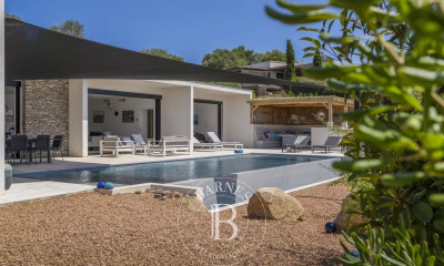 Référence Agence: VIA-602 DISPONIBILITÉS - SAISON - 2026 - Du 11 avril au 6 juin - Du 13 au 20 juin - Du 27 juin au 25 juillet - Du 22 au 31 août Villa entièrement climatisée de 300 m² habitable construite sur les hauteurs et bénéficiant d'une vue panoramique sur la baie de St Cyprien, la Tour de Pinarellu et le golfe de Porto-Vecchio. Terrain arboré de 2.900 m² Niveau principal ouvert sur la terrasse: Entrée avec vestiaires. Vaste réception comprenant: - Cuisine ouverte équipée avec îlot central et cellier, - Séjour avec cheminée, canapés et TV (Canal + /sat, Netflix), système audio Marshall. - Toilettes d'invités avec vasque. - Une chambre " master 1 " avec terrasse privative et vue mer: lit en 180 X 200, TV avec TNT, dressing, salle d'eau ouverte avec vasque et douche, WC séparés. Niveau inférieur: Les quatre chambres s'ouvrent côté mer: - Deux chambres avec chacune un lit en 180 X 200, une salle d'eau ouverte avec vasque et douche, WC séparés. - Une chambre avec 2 lits en 90 pouvant être réunis, salle d'eau ouverte avec vasque, douche et WC. - Une chambre " master 2 " avec un lit en 180 X 200, TV avec TNT, coin bureau, dressing, salle de bains avec vasque, douche, baignoire et WC séparés. - Buanderie avec lave-linge, sèche-linge, rangements et évier. Studio indépendant (vue mer): - Chambre sur mer avec un lit en 160 et coin cuisine équipée (mini-réfrigérateur, micro-ondes..). - Salle d'eau avec vasque et douche, toilettes séparées. Salle de sport indépendante avec tapis de course, vélo + vélo elliptique, yoga.. - Salle d'eau avec douche et WC Terrasses aménagées: canapés extérieurs, plancha, douche et WC. Piscine chauffée et sécurisée (Volet roulant) de 17 X 4m. Terrain de pétanque.