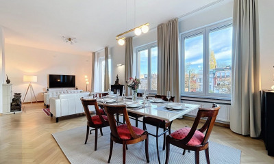 Situé sur l'une des plus prestigieuses avenues de Bruxelles, appartement dans un immeuble de haut standing (20 mètres de façade) avec une vue imprenable sur l'Abbaye de la Cambre. Il bénéficie d'une superficie habitable de +/- 274m2, une hauteur sous plafond de 3,05m. Magnifiques finitions : parquet contemporain, moulures, feux ouverts en marbre. Cuisine hyper-équipée de haut de gamme (Sie Matic) d'une surface de +/- 30m2 (Electroménager Miele, plan de travail en céramique, meubles laqués en blanc, robinetterie Dornbracht). Le salon et la salle à manger en suite d'une superficie de +/-77m2 avec vues panoramiques sur l'Abbaye de la Cambre. L'appartement est composé de 3 chambres : la Master Bedroom avec dressing et salles-de- bains avec une superficie de +/-70m2. • La deuxième chambre de +/-26m2 avec salle d'eau et dressing de +/-10m2 • et la troisième chambre de /+20m2. Il est agrémenté d'une petite terrasse. Autres : 2 grandes caves et un logement de service de 25 m2 (au dernier étage) avec point d'eau.Possibilité d'acquérir un box fermé motorisé. Châssis neufs double vitrage (Veka), coefficient thermique 1,0. Nouvelle chaudière à gaz individuelle de marque Viessmann à condensation (ultra basse consommation). Electricité et plomberie entièrement remises à neuf. Système d'alarme et surveillance par caméra IP (fonctionnement type domotique). Câblage internet et satellite disponible dans tout l'appartement. PEB: E+