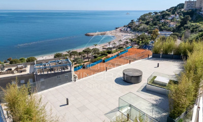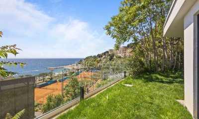 CAP D'AIL - CHÂTEAU SAINT GEORGES. Unique aux portes de Monaco, dans une résidence de standing sécurisée avec concierge, piscines et au calme absolu, nous vous proposons ce magnifique appartement villa en duplex avec vue mer, terrasses et jardin . Au premier étage, belle entrée, cuisine indépendante équipée, salon/salle à manger, 2 chambres, 1 salle de bains avec wc, 1 salle de douche avec wc. Toutes les pièces à vivre donnent sur une terrasse d'angle de 44 m2 avec très jolie vue mer et verdure. A l'étage inférieur, niveau jardin, desservi par un bel escalier en bois en colimaçon, 2 chambres, 2 salles de douche avec wc, buanderie, rangements. Toutes les pièces donnent également sur un très bel extérieur de 81 m2 composé d'une terrasse avec jardin privatif. Toutes les chambres sont aménagées de dressing.Climatisation réversible, gardien, piscine, espaces verts et 2 caves. Possibilité garage et double garage en plus. Possibilité de diviser en deux appartements (3 pièces et 2 pièces) avec 2 portes palières. Honoraires à la charge du vendeur.