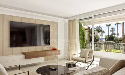 Au cœur de la Croisette, avec vue sur la mer et un jardin, ce somptueux appartement de trois pièces de 127 m² "Loi Carrez", ainsi que 29 m² de terrasses, a récemment bénéficié d'une rénovation intégrale et haut de gamme. Il se compose d'une entrée, séjour-cuisine de 56 m², deux chambres spacieuses avec salles de bains en suite, et une buanderie. Cave en sous-sol. Option disponible : un garage double en supplément.