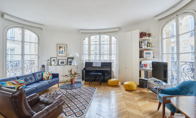 À Paris, 2e arrondissement, au sein du quartier Vivienne, dans un immeuble de 1839, un appartement de 132 m², au calme d'une cour intérieure. Situé dans le 2e arrondissement de Paris - quartier Vivienne -, au sein d'un immeuble de 1839 de style Louis-Philippe, le bien présente une surface de quelque 132 m². Il se loge au calme d'une cour intérieure pavée, au premier étage d'une copropriété de six niveaux avec ascenseur, et bénéficie de la présence d'une gardienne. La façade en pierre, côté rue, présente une abondante modénature avec bossage au premier niveau, balcon filant sur consoles richement sculptées protégé par un garde-corps en fer forgé finement ciselé au deuxième niveau, encadrements de baies droites moulurés et sculptés, bandeaux d'étage et corniche, notamment. Les élévations côté cour sont classiquement plus sobres, quoique s'y donnent aussi à remarquer des pilastres ioniques, entablements sculptés, bandeaux d'étage à denticules, encadrements et entablements de baie moulurés. L'entrée s'effectue, depuis la rue, par une imposante porte cochère en bois peint en bleu, vitrée et surmontée d'une imposte pareillement vitrée, protégée comme les deux ouvrants au dessous par une ferronnerie finement ouvragée, à motifs végétaux et géométriques. Elle ouvre sur un long porche au sol pavé et au plafond voûté, abondamment ornementé de sculptures à motifs floraux et foliaires, qui débouche sur la cour, également pavée de terre cuite et végétalisée avec des arbustes en pots. L'accès au logement se fait à droite par un ascenseur ancien à cage grillagée ou par les escaliers en bois qui entourent cette dernière, avec rampes en bois ou en fer de part de d'autre. L'appartement se compose d'une entrée, d'un espace salle à manger-cuisine de près de 28 m², d'un salon d'environ 38 m², et de deux chambres, dont l'une, de près de 27 m², est issue de la réunion de deux pièces originellement séparées. S'y trouvent enfin une salle de bain doublement équipée d'une baignoire et d'une douche ainsi que, plus loin, des toilettes. Des placards et des bibliothèques ont été installés dans l'ensemble de l'appartement. Chacune des pièces du logement donne sur une cour, orientée est-ouest, au calme. S'y ajoute enfin une cave d'environ 5 m² en sous-sol.