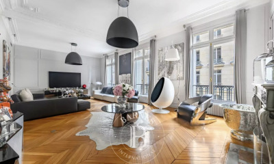 Dans une rue calme du quartier des Ternes, au 2e étage d'une propriété pierre-de-taille de grand standing, appartement de réception de 144 m2 Loi Carrez avec 3,50m de hauteur sous plafond. Le bien, en très bon état, comprend en partie réception : une entrée et un vestiaire, un double séjour et une salle-à-manger, une cuisine dînatoire, des toilettes invités. La partie nuit est composée de 2 grandes chambres, d'une salle de bains, d'une buanderie et d'un hammam, de toilettes séparées. Parquets, moulures, cheminée et trumeau. Cave. Gardien à demeure.