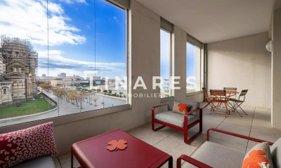 À Marseille, dans le quartier d'Arenc, bénéficiant d'un parking, un appartement contemporain de 91 m² avec terrasses, au 7e étage d'un immeuble récent. Le programme « 2ème Élément », achevé à la fin de l'année 2019, s'inscrit dans une démarche environnementale affirmée, conforme à la charte du Bâtiment Durable Méditerranéen (BDM). Conçu par le groupe Quartus et Pitch, le projet fait le choix de la simplicité maîtrisée et refuse toute surenchère technologique. L'immeuble s'élève autour d'un jardin paysager partagé par les résidents. Au 7e étage de cet ensemble, l'appartement, particulièrement lumineux, s'étend sur une surface d'environ 91 m², donne sur le jardin. Depuis la terrasse et la loggia, la mer se dévoile au loin.