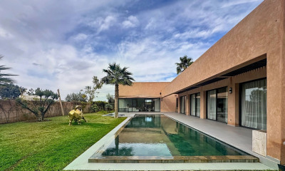 Située à une vingtaine de kilomètres de Marrakech route de l’Ourika, la propriété vous offre un cadre luxuriant et une vue imprenable sur les cimes enneigées de l’Atlas. Le terrain arboré et paysagé de 4 hectares offre un plan d’eau de 5000 m2 suivi par une piscine résolument moderne de 50 m de longueur. La maison principale s’intègre parfaitement dans cet écrin de verdure. La simplicité apparente des volumes sous-tend avec discrétion l’extrême sophistication de tous les dispositifs techniques (chauffage au sol, climatisation réversible, piscine chauffée…). Le bâtiment principal offre 2 chambres dont une avec sa piscine privative, des salles d’eau aux touches marocaines par l’utilisation d’un tadelakt revisité pour rester dans l’esthétique moderne du reste de la maison, un spa, une salle de cinéma ainsi que différents espaces pour se réunir et partager des moments conviviaux. Annexé au bâtiment principal, vous trouverez différents pavillons proposant respectivement, 4, 2 et 3 suites spacieuses et élégantes. Les contraintes climatiques n’ont pas freiné la créativité architecturale et sont devenus le moteur de ce projet.?Dans un processus écologique, la proximité des façades Sud (chaudes) et Nord (froides) induite par la forme toute en longueur du bâtiment principal, lui procure par convection, un conditionnement naturel. Celui-ci associé à une isolation thermique rigoureuse permet de réduire considérablement les dépenses énergétiques superflues tout en autorisant de larges baies vitrées ouvrant sur de profondes terrasses. Présenté par BARNES MARRAKECH agence immobiliere marrakech - immobilier luxe marrakech-vente villa marrakech