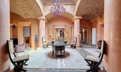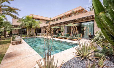 Située sur le prestigieux domaine d’Amelkis à Marrakech, cette villa contemporaine marie avec élégance modernité et inspiration ethnique, grâce à sa façade et ses murets en pierre sèche. Conçue sur un terrain de 1 800 m² en front de golf et développant 700 m² couvert, elle bénéficie d’un aménagement paysager signé par un architecte de renom et de prestations haut de gamme. Rez-de-chaussée • 3 suites indépendantes, chacune avec terrasse privative et jardin clos de murs en pierre sèche devant la salle de bain • 1 vaste suite parentale • Salon avec cheminée ouvert sur terrasse couverte • Salle à manger indépendante et cuisine équipée avec office • Piscine de 22 x 4 m avec pool house Étage (accessible par ascenseur) • 1 seconde suite parentale avec terrasse privative • Salon avec cheminée offrant une vue panoramique sur la piscine à débordement et le golf • Grande terrasse aménagée comprenant : • Bar • Piscine à débordement 10 x 6 m avec double fond en verre transparent (6 m), créant un effet spectaculaire et une vue unique sur le lac et le golf • Salon de plein air et espace transats pour profiter de la vue et du climat Sous-sol • Salle de cinéma (pouvant être aménagée en spa) au choix • 2 chambres pour le personnel • Buanderie, cellier et local technique • Très grande cour anglaise apportant lumière naturelle • Accès différencié : escalier extérieur réservé au personnel et ascenseur reliant les niveaux principaux pour les habitants Confort & équipements • Chauffage au sol • Climatisation gainable inverter par pièce • Deux piscines chauffées Piscine avec vue exceptionnelle sur l’Atlas et le golf Une villa rare à Marrakech, conjuguant design contemporain, authenticité de la pierre sèche, confort ultime et emplacement golfique privilégié, pensée comme une véritable résidence de prestige.