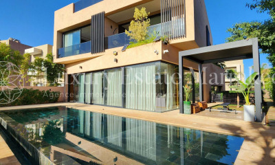 Cette villa de plain-pied, située en lisière de forêt dans un quartier calme, offre un cadre de vie paisible et lumineux. Elle s'étend sur 154 m² sur un terrain clos de 1 200 m² et comprend un grand espace de vie avec salon, cheminée, salle à manger et cuisine ouverte. La villa dispose de trois chambres, chacune avec sa propre salle de bain et rangements. À l’extérieur, on trouve une terrasse avec piscine privée (7x3 m), un coin repas couvert et un jardin arboré avec un hammam beldi, une salle de repos et une terrasse sous pergola. L'équipement moderne inclut une piscine avec filtration solaire, un arrosage automatique, un portail motorisé, ainsi qu'un forage privé et diverses installations écologiques. L'accès se fait par une piste de 700 m, et le terrain permet la construction d’un étage supplémentaire. C'est un véritable havre de paix, alliant confort et tranquillité.