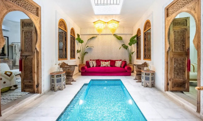 Nichée au cœur du prestigieux domaine du Royal Palm, à quelques pas de l’hôtel Fairmont et idéalement située en première ligne de golf, cette somptueuse propriété offre un cadre de vie exclusif alliant raffinement, confort et intimité absolue. Édifiée sur un jolie terrain en première ligne, avec une belle surface habitable, la villa séduit par ses volumes généreux, sa luminosité et la qualité exceptionnelle de ses finitions. Le séjour et la salle à manger, ouverts sur les terrasses et le jardin, offrent une vue dégagée sur le golf et disposent d’une cheminée intégrée. La cuisine contemporaine est entièrement équipée avec du matériel haut de gamme. Une liste exhaustive pourra être envoyée sur demande. La villa dispose de quatre suites élégantes, chacune avec salle d’eau, dressing, toilettes et accès direct au jardin, garantissant une intimité totale. La suite parentale comprend une somptueuse salle de bain équipée. La propriété inclut également une salle de massage dédiée, une chambre de personnel, et un garage couvert avec porte automatique. Les extérieurs ont été soigneusement aménagés avec une piscine en pierre de Bali équipée d’un volet roulant automatique et d’une pompe à chaleur, un gazebo en bois tataoui, un jardin paysager avec plantations sur mesure, et du mobilier extérieur haut de gamme. Les casquettes des terrasses ont été agrandies et l’éclairage extérieur entièrement repensé pour un confort optimal. Les caractéristiques techniques : liste exhaustive pourra être envoyée sur demande. Le mobilier et les équipements ont été choisis avec un soin particulier. La villa combine ainsi luxe, confort et raffinement, offrant une expérience résidentielle unique dans l’un des domaines les plus prestigieux de Marrakech.