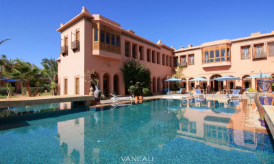 Superbe villa de 5 chambres, située en première ligne du prestigieux Golf du Royal Palm, à seulement 13 km du cœur de Marrakech. Elle dispose d’une salle de sport, hammam, sauna, salle de massage, ainsi que d’un vaste jardin avec terrasse, jacuzzi et piscine chauffée. la villa, véritable oasis de luxe et de tranquillité au cœur du Golf du Royal Palm. Cette villa d’architecte allie raffinement contemporain et équipements haut de gamme. Elle offre une vue imprenable sur l’Atlas, un accès direct au golf, un jacuzzi, une piscine de 20 mètres et des intérieurs spacieux, modernes et élégants. Les chambres Chaque chambre au nombre de 5, reflètes l’élégance contemporaine avec mobilier raffiné et équipements luxueux. Certaines chambres disposent de douches extérieures pour profiter pleinement de la nature environnante. Chambre 1 (rez-de-chaussée) : 2 lits (1 double 200 cm, 1 simple), salle de bain privée avec baignoire, douche, 2 vasques et WC. Climatisation, cheminée, table de bureau, salon, TV, coffre-fort, dressing et terrasse privée. Chambre 2 (rez-de-chaussée) : 1 lit double 200 cm, salle de bain privée avec baignoire, douche, 2 vasques et WC. Climatisation, salon, TV, coffre-fort, dressing et terrasse privée. Chambre 3 (rez-de-chaussée) : 1 lit double 180 cm, salle de bain privée avec 2 vasques et WC. Climatisation, TV, coffre-fort, terrasse privée et douche extérieure. Chambre 4 (rez-de-chaussée) : 1 lit double 180 cm, salle de bain privée avec 2 vasques et WC. Climatisation, TV, coffre-fort, terrasse privée et douche extérieure. Chambre 5 (rez-de-chaussée, accès direct à la piscine) : 1 lit double 180 cm, salle de bain privée avec douche et 2 vasques. Climatisation, table de bureau, salon, TV, coffre-fort, dressing et terrasse privée. Comprend également un salon privé avec accès direct à la piscine et une cuisine indépendante. Le vaste espace de vie est décoré avec goût et offre une atmosphère apaisante et sophistiquée. Le salon contemporain invite à la détente, la salle à manger promet des repas mémorables et le salon TV est idéal pour les soirées cinéma. Pour le confort et le bien-être, la villa dispose également d’une salle de sport et d’un espace Spa avec hammam et sauna. Le jardin, soigneusement aménagé, entoure une piscine chauffable et un jacuzzi (20 x 5 m, profondeur 0.2 à 1.5 m), parfaits pour se détendre tout en admirant le panorama sur le golf et l’Atlas. La terrasse offre un espace idéal pour bains de soleil ou dîners en plein air.
