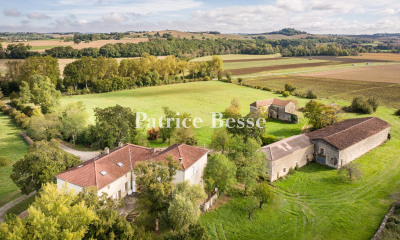 Vue d'ensemble Nous accédons à cette propriété par une route qui grimpe jusqu'au sommet d'une colline offrant une vue panoramique sur la campagne environnante, visible sur trois côtés. Nous découvrons ici une ancienne propriété d'Armagnac en pierre, entourée de somptueux jardins et d'arbres centenaires, dont des chênes et des cèdres majestueux. Les précédents propriétaires n'occupaient que quelques pièces, laissant le reste à l'abandon, si bien qu'à leur acquisition, les propriétaires actuels ont entrepris d'importants travaux de rénovation. Ils ont investi leur cœur et leur âme dans ce projet, réalisant ainsi leur rêve ; leur départ n'est motivé que par des circonstances imprévues. La propriété se compose d'une maison principale, d'un gîte attenant, de vastes granges et garages, ainsi que de plus de 6 hectares de parcs, de champs, de jardins potagers et d'un grand étang. Rez-de-chaussée Derrière son apparente simplicité extérieure, cette maison révèle dès l'entrée l'empreinte forte de ses propriétaires actuels. Chaque espace allie élégance contemporaine et charme authentique de l'ancien. La fonctionnalité pratique se marie ici à une esthétique intemporelle, créant une atmosphère de confort et de raffinement. Sur la droite en entrant, se trouve une première grande chambre dotée d'un sol en carreaux rouges, d'une large fenêtre, et d'une salle d'eau attenante avec WC séparé. Idéale pour des invités en quête d'indépendance ou pour une activité de chambre d'hôtes, cette pièce peut être isolée du reste de la maison par une porte vitrée verrouillable. Après cette chambre, une porte vitrée nous mène au spacieux salon, baigné de lumière grâce à ses fenêtres sur deux côtés. Le parquet ancien souligne l'harmonie entre style classique et touches contemporaines que l'on retrouve dans toute la maison. Derrière le salon, une seconde chambre est aménagée au rez-de-chaussée. Un large couloir conduit à la salle à manger et à la cuisine attenante. La personnalité des propriétaires s'y exprime pleinement : parquet en chêne clair, et une immense fresque représentant La Jeune Fille à la perle de Vermeer, conférant une originalité certaine à l'espace. La cuisine moderne, élégante et ultra-fonctionnelle, s'ouvre sur le jardin par de grandes baies vitrées en fer forgé. Un îlot central accueille un évier en inox, de vastes plans de travail et de nombreux rangements. Un grand piano de cuisson à gaz a été installé, et il y a un grand garde-manger ouvert d'un côté avec de la place pour à peu près tout ce dont vous avez besoin dans une cuisine. Une porte latérale de la salle à manger donne accès à une terrasse couverte, à la buanderie équipée d'un grand évier en céramique et de trois chauffe-eaux, ainsi qu'à un grand placard de rangement. Enfin, une salle d'eau et des WC séparés desservent la chambre du rez-de-chaussée. Premier étage Un escalier traditionnel en bois – sous lequel se niche une cave à vin – mène au palier du premier étage, spacieux et lumineux. À l'origine conçu avec deux chambres de chaque côté, cet étage a été repensé pour accueillir deux suites indépendantes. Côté droit, la suite parentale offre une vaste chambre avec parquet en châtaignier et cheminée en pierre, prolongée d'un dressing ouvert sur une salle d'eau contemporaine avec WC. À gauche du palier, la seconde suite comprend une grande chambre avec un beau parquet, un dressing, une salle d'eau équipée de trois vasques, et des toilettes séparées. Le tout a été rénové avec un soin remarquable. Le gîte Attenant mais indépendant grâce à son propre accès, le gîte se compose de deux chambres et d'une salle de bain. Au rez-de-chaussée : un hall d'entrée élégant, une cuisine moderne aux tons bleu cobalt entièrement équipée, et un salon lumineux aux poutres apparentes et murs blancs. À l'étage, deux belles chambres aux hauts plafonds et poutres exposées encadrent une salle d'eau commune avec douche, lavabo et WC. Le gîte peut communiquer avec la maison principale via la buanderie, mais l'accès peut être verrouillé. Cette dépendance offre de nombreuses possibilités : accueil familial, location saisonnière, ou activité professionnelle. Jardins Les jardins, finement structurés par de petits murets en pierre, des sentiers sinueux et des massifs fleuris, entourent la propriété. Partout, de vastes pelouses, des rosiers grimpants, et des arbres en fleurs enchantent le regard. Les vues panoramiques depuis les jardins sont véritablement spectaculaires. Dépendances Pour les amateurs de grands espaces, les dépendances sont nombreuses et en excellent état : • Grand corps d'écurie, • Grange viticole, • Hangar ouvert pour tracteurs et véhicules, • Ancienne maisonnette de métayer avec cheminée en pierre. À l'arrière de la maison, une allée privée descend à travers champs jusqu'à un grand étang, idéal pour des pique-niques estivaux. Le cadre est parfait pour accueillir chevaux ou moutons. Potager En complément des jardins d'agrément, un vaste potager de plus de 4000 m² abrite des vignes, un verger, et un solide poulailler clôturé. Il y a plus de 200 arbres fruitiers sur le domaine, ainsi que deux puits. Parfait pour ceux qui rêvent de cultiver leur propre production biologique ! Un mur de pierre bâti par les propriétaires longe l'arrière du jardin, qui jouxte également 4000 m² de bois privés. Chez Bliss Les propriétaires ont su marier des couleurs modernes aux matériaux traditionnels (murs en pierre, poutres apparentes) dans une restauration méticuleuse. Aucun recoin poussiéreux ici : chaque espace a été pensé, soigné et magnifiquement entretenu. À l'extérieur, l'esprit de vie à la campagne est omniprésent : jardins enchanteurs, vastes prairies et potager généreux. La propriété, située sur une petite route de campagne sans vis-à-vis, jouit d'une