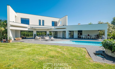 L'agence CAZA Immobilier vous présente en EXCLUSIVITE Haut Bouliac Villa de standing , aux prestations haut de gamme et à la décoration soignée située sur les hauteurs de Bouliac en immersion dans la forêt, dans un beau lotissement récent. Sur une belle parcelle paysagée d'environ 928 m2, elle dispose d'un espace habitable totale de 210 m2 et d'un garage isolé d'environ 22 m2 La villa offre un double environnement ; côté sud un espace piscine et côté nord une terrasse en bois exotique donnant sur un parc boisé. En rez de chaussée : belle entrée généreuse donnant sur une très agréable pièce à vivre baignée de lumière avec une hauteur de plafond unique La pièce dispose d'une cuisine haut de gamme avec un équipement complet. Dans la continuité des espaces de vie, on découvre une chambre indépendante de plus de 15 m2 avec sa salle d'eau , ainsi qu'une très belle suite parentale d'environ 40 m2 , avec son grand dressing et sa salle d'eau. A l'étage : beau pallier donnant accès à deux grandes chambres , un espace cellier/buanderie , et une salle de bains. La parcelle joliment arborée et paysagée dispose de deux terrasses en bois exotique , d'un garage non attenant d'une surface d'environ 22m2 ainsi qu'une belle piscine de belles dimension avec rideau immergé. Pour plus de renseignements sur cette maison l'équipe CAZA immobilier est à votre disposition par mail ou téléphone