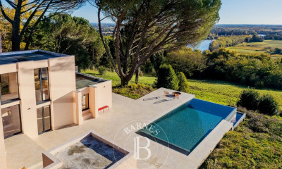 Villa d'Architecte « La Californie » avec Vue Panoramique, Piscine à Débordement et possibilité de bénéficier de 4 Hectares aux Portes de Bordeaux À seulement 30 minutes du centre de Bordeaux, perchée au sommet d'une colline, cette villa moderniste de 1974 signée par l'architecte bordelais André Morier offre une expérience unique : ici, on a littéralement l'impression de dominer le monde. La vue est tout simplement époustouflante, embrassant coteaux verdoyants, vallée de la Garonne et horizon à perte de vue. Une rénovation d'exception Entièrement repensée en 2024 par le studio Vaissié, la villa « La Californie » (390 m² habitables) a été sublimée par une rénovation intégrale mêlant béton ciré, enduits à la chaux, bois noble et pierre naturelle. Chaque espace respire l'élégance, l'équilibre et la modernité. Un domaine rare – jusque 4 hectares de sérénité • 2 hectares de vignes (à conserver ou à transformer selon vos projets : parc paysager, domaine équestre, verger…) • Une source naturelle • Un terrain de pétanque • Un double carport Le tout dans un environnement préservé, intime et sans aucune nuisance, garantissant une atmosphère de calme absolu. Des espaces ouverts et lumineux • Séjour cathédrale aux lignes pures avec baies vitrées panoramiques • 5 chambres, dont une somptueuse suite parentale avec dressing & salle de bains • 2 chambres indépendantes pour invités • Salon TV, bureau, salle de sport • Pool house avec douche, toilettes & barbecue À l'extérieur, la piscine à débordement chauffée en mosaïque (10,5 x 5 m) se fond dans le paysage, créant une continuité hypnotique entre ciel, eau et horizon. Prestations haut de gamme • Cuisine design équipée Gaggenau & Liebherr • Isolation intégrale & peintures à la chaux • Cheminée, climatisation, fibre optique, alarme connectée • Possibilité d'acquisition meublée et équipée Un emplacement idéal pour Bordeaux & Paris La localisation, souvent perçue comme un peu en retrait, devient en réalité un atout stratégique : • Gare de Portets à 8 min avec liaisons directes vers Bordeaux Saint-Jean (30 min) – TGV Paris en 2h • 30 min de l'aéroport Bordeaux-Mérignac • 35 min de Saint-Émilion • 1h10 du Bassin d'Arcachon et de l'Océan • École Montessori bilingue à 15 min Une œuvre d'art habitée « La Californie » n'est pas simplement une maison. C'est une propriété d'architecte unique près de Bordeaux, pensée pour celles et ceux qui recherchent une alliance rare : vue à couper le souffle, architecture moderniste, nature préservée et accessibilité directe à Paris. Contact : Valéria Plaisance –