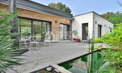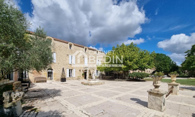 Au sud de Bordeaux, proche de Langon, une maison de maître girondine retouchée au 19e s , avec 10 chambres, et son parc de plus de 1,5 ha avec piscine. Au bout d'un petit village, la maison est entourée par la campagne, avec un voisinage tenu à bonne distance, dans un paysage de champs, de prairies et de bois. À l'écart de la petite route départementale qui le dessert, un chemin mène à l'entrée de la propriété pour découvrir le logis principal, entouré d'un espace enherbé et boisé, orienté plein sud et incluant une grande piscine un peu en retrait. Mentionnée sur la carte de Cassini, la demeure est élevée de deux niveaux, séparés par un bandeau d'étage en pierre, sous combles aménageables. Elle est orientée est-ouest et divisée en trois : un corps central en saillie et deux ailes, plus basses et en appui, dont les toitures sont prolongées au nord pour abriter les dépendances. Non loin, se tiennent un petit pavillon flanqué de quatre tourelles, renfermant une serre et quelques remises, ainsi que, à l'arrière, un vieux hangar à tabac. Le parc s'étend à la fois à l'avant et à l'arrière de la maison, donnant ainsi des espaces où alternent calme et animation.
