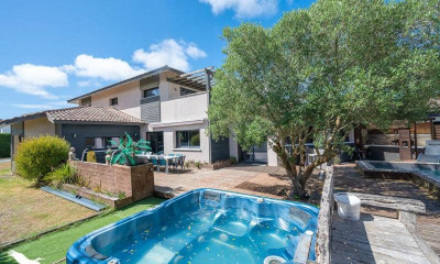 Maison moderne entre Azur et Messanges 104 m2 Terrain de plus de 1000 m2 Située entre Azur et Messanges, à seulement quelques minutes des plages landaises, cette maison contemporaine de plain-pied offre un cadre de vie paisible et ensoleillé, au coeur de la nature landaise. D'une surface habitable de 104 m2, elle se compose d'une pièce de vie spacieuse et lumineuse, ouverte sur une cuisine équipée moderne, avec accès direct à un cellier fonctionnel. Un poêle à granulés apporte une touche chaleureuse à l'ensemble. La partie nuit se compose de : 3 chambres , dont une suite parentale avec salle d'eau, une salle d'eau indépendante et deux wc. Le tout sur un terrain clos de plus de 1000 m2, piscinable, avec deux places de stationnement et un garage sécurisé. L'environnement est calme, bien situé entre forêt et océan.