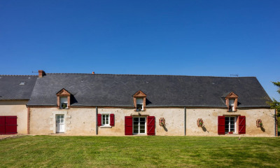 Dans le Maine-et-Loire, à 30 min d'Angers, un corps de ferme rénové du 16e s. avec ses dépendances, son verger et sa piscine. Encadré de deux pilastres en pierre de taille, un portail en bois marque l'entrée du corps de ferme. La propriété dépendait autrefois d'un manoir, situé de l'autre côté de la rue. Construit au 16e s., l'ensemble fut la résidence d'Hercules de Moreau, valet ordinaire de la chambre du roi, puis au 18e. s de la famille Guéniveau, qui le transmit par héritage à Joseph-Eugène Bonnemère. Homme de lettres et dramaturge, ce dernier a été rendu célèbre par son ouvrage « Histoire des paysans ». Le bâtiment principal du corps de ferme est élevé en pierre de tuffeau, en moellon sur les façades et en pierre de taille aux encadrements des baies. L'édifice est coiffé d'une toiture en ardoise à deux pans. Les baies se succèdent en nombre, côté nord comme côté sud, dans un alliage de verre et d'acier. Attenant, un porche donne accès aux caves. Sa toiture en croupe est soutenue par quatre pilastres moulurés. En face, un autre corps de bâtiment partiellement aménagé abrite un four à pain. Érigé au centre des deux corps, le grenier à grain est élevé de deux niveaux et coiffé d'une toiture à trois pans. Sa façade occidentale est en pierre de taille et percée de trois oeils-de-boeuf. Une ancienne écurie est située au fond du jardin. Enfin, accessible depuis l'extérieur, un verger clos de murs abrite une piscine.